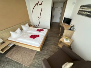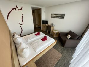 Unsere liebevoll eingerichteten Doppelzimmer (auch zur Einzelnutzung buchbar) mit Glasfront, Terrasse und Blick auf die Pferdekoppeln laden zum verweilen ein. Den Sonnenuntergang (oder für Frühaufsteher den Aufgang) auf der eigenen Terrasse mit Bergpanorama zu genießen ist ein ganz besonderes Erlebnis. Desweiteren verfügen unsere Zimmer über eine Minibar, Wasserkocher mit Tees und Kaffee und weiteren Annehmlichkeiten.